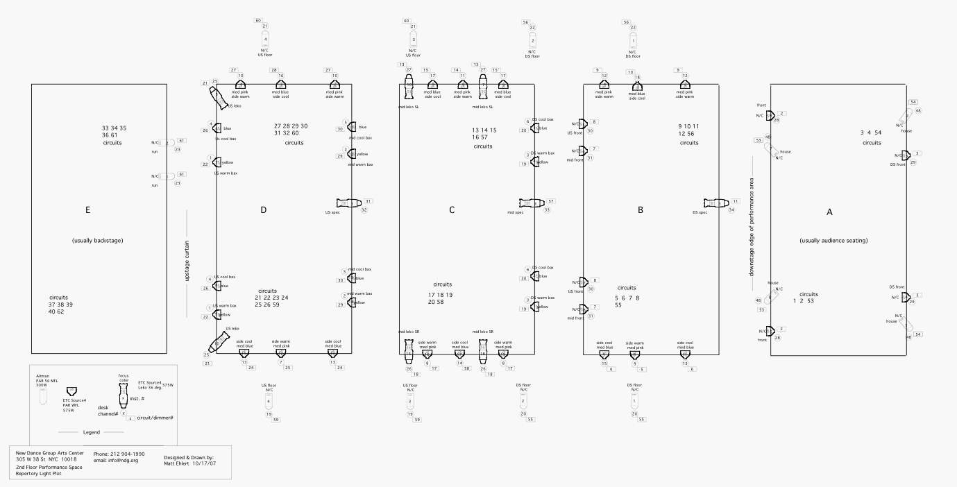 New Dance Group owns a certain amount of lighting equipment, hung in the spaces in a “rep plot” arrangement.